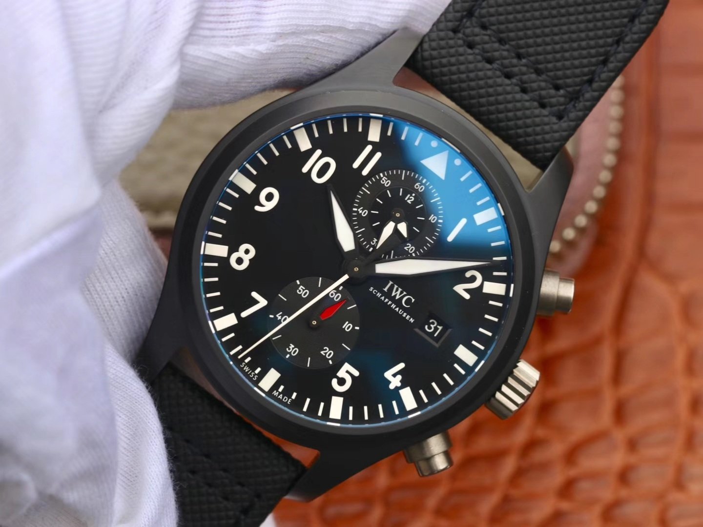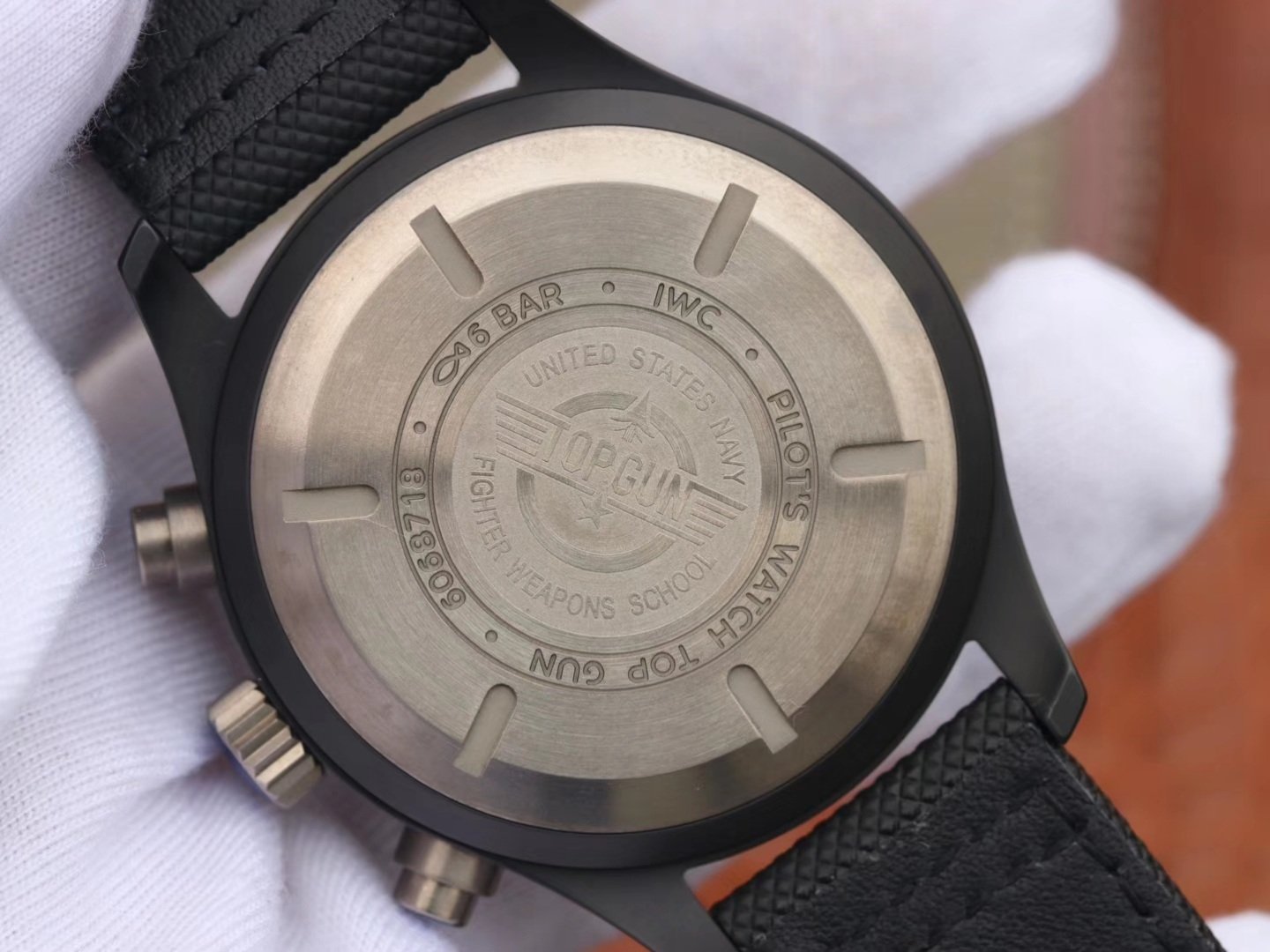IWC Pilot Series TOP GUN Naval Air Warfare Force MIRAMAR timing watch. Glorious appearance of the watch size 44X16.5mm high-strength ceramic case is lighter and stronger than traditional fine steel, ZF perfectly restores the delicate luster and soft texture of the genuine case, grasping the details, extreme re-engraving. The original IWC89361 movement was modified based on the powerful Dandong movement. The diameter and thickness are the same, to achieve all the functions of the genuine movement, 6-point small second hand with a stop device, 12 o'clock position in the reading mode to show the cumulative hour precision minute timing. The commissioning technique is also synchronized with the original. Strap buckle: using the U.S. military composite fiber braided strap, waterproof breathable, comfortable and durable, with IWC titanium folding buckle.